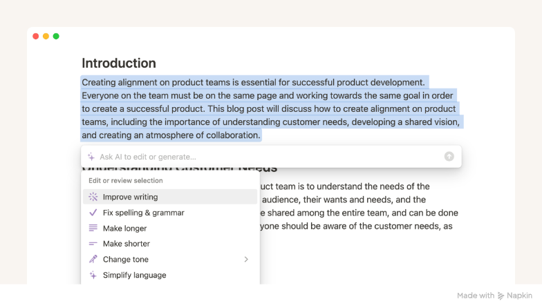 Notion AI gets this right. When it generates content, you can immediately regenerate, change the tone, make it longer or shorter, or edit it inline. The AI is a collaborative partner, not a replacement for your judgment.